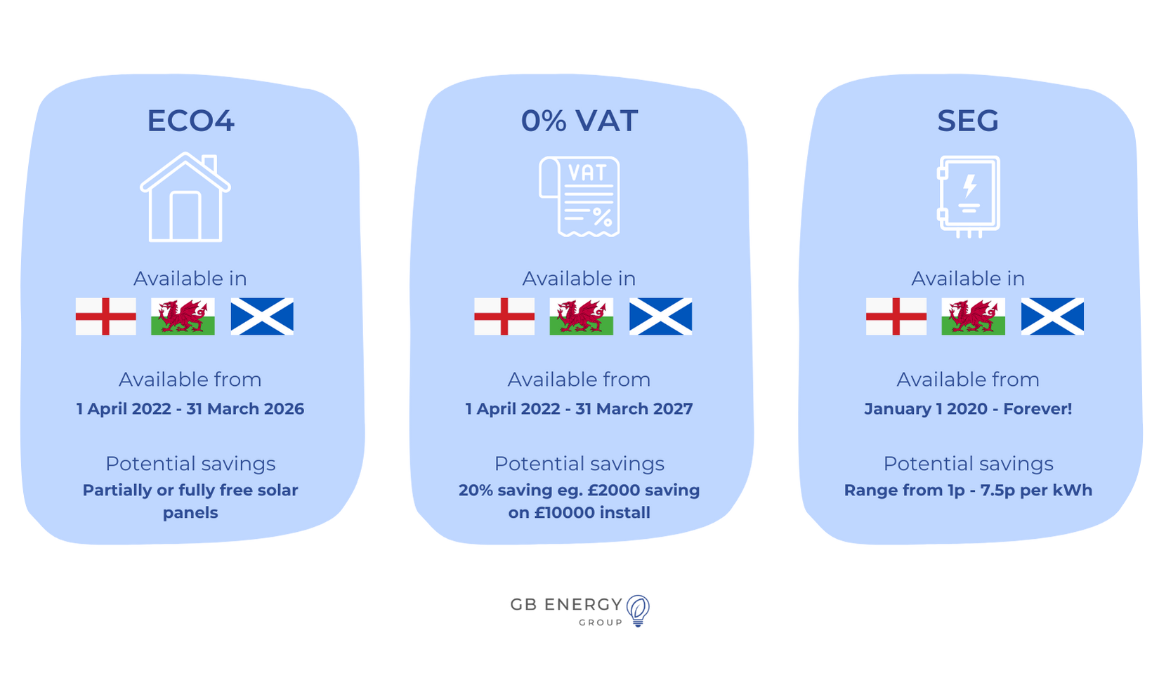 0% VAT: Available in England, Scotland, and Wales from April 1, 2022, to March 31, 2027. This scheme offers potential savings of £1,300+ on installation & energy bills.